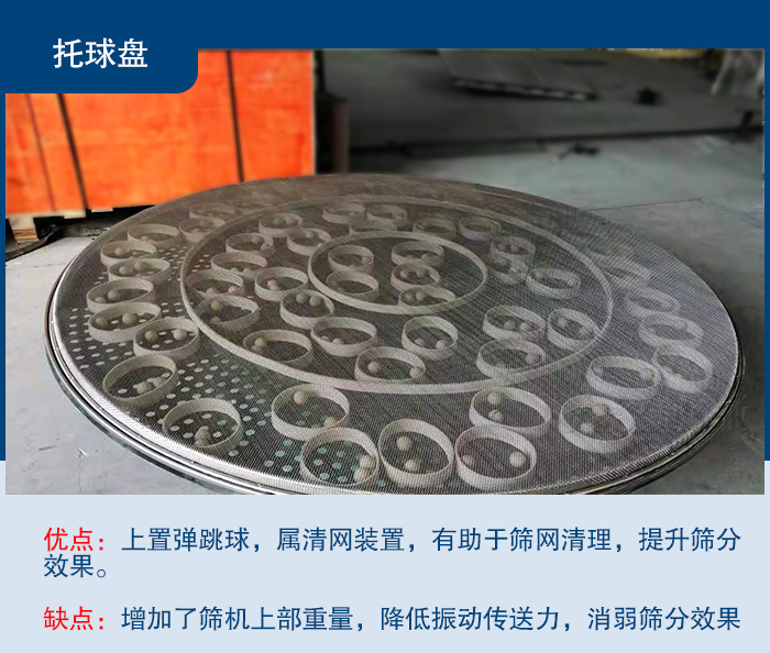 旋振篩上置彈跳球,屬清網(wǎng)裝置,有助于篩網(wǎng)清理,提升篩分效果。但它增加了篩機(jī)上部重量,降低振動(dòng)傳送力,消弱篩分效果。如托球板開裂,而是否加裝托球板,取決于篩分需求。